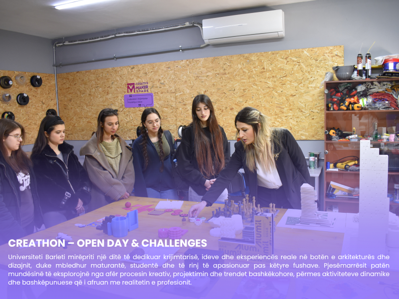 Universiteti Barleti organizoi aktivitetin “CREATHON – Open Day & Challenges”, një ditë e dedikuar krijimtarisë, dizajnit dhe arkitekturës, duke mirëpritur maturantë, studentë dhe të rinj të apasionuar pas këtyre fushave.