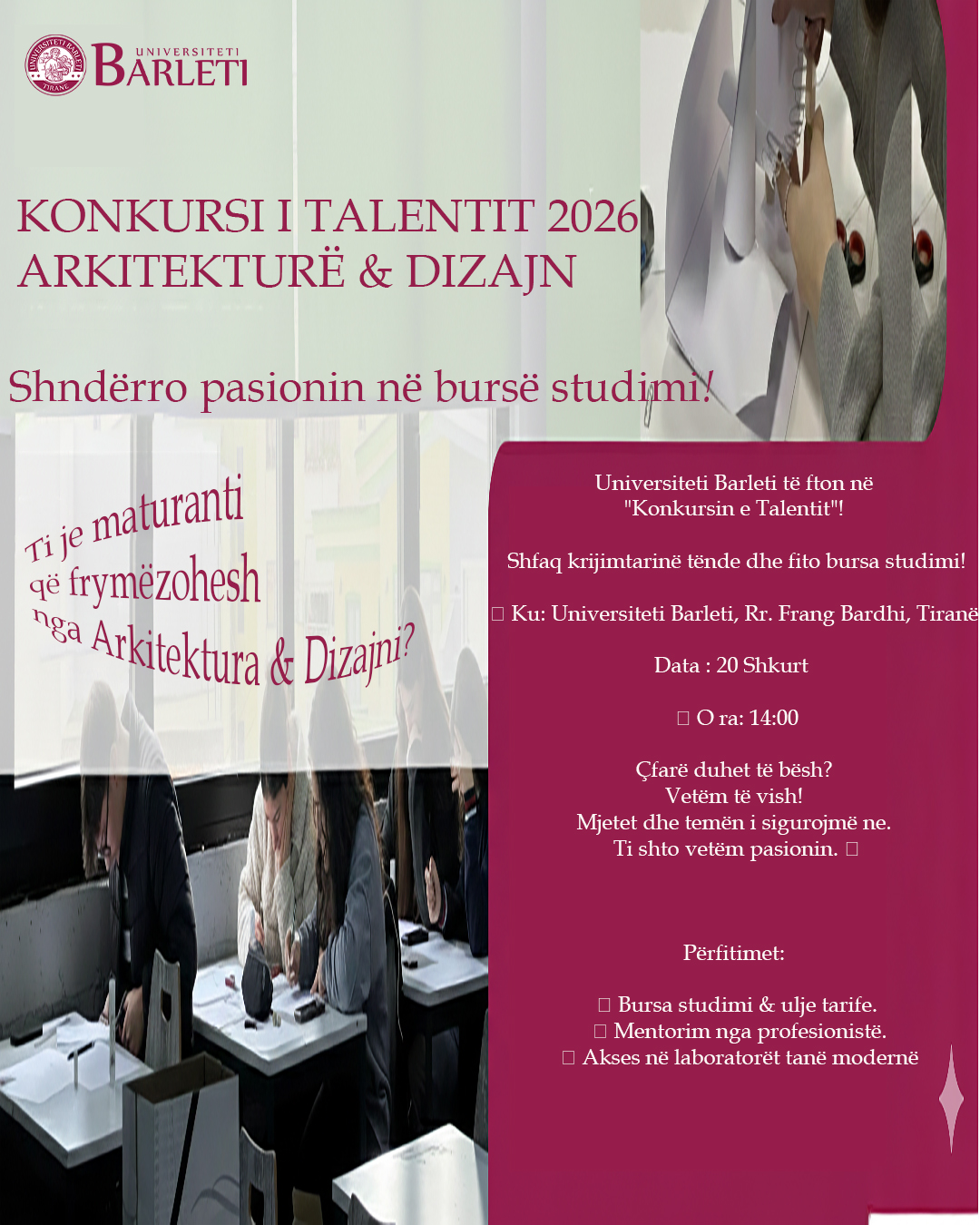 Universiteti Barleti fton të gjithë maturantët e apasionuar pas arkitekturës dhe dizajnit të bëhen pjesë e “Konkursit të Talentit”