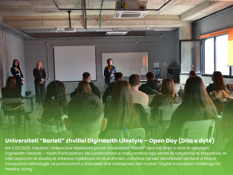 11.03.2026, Fakulteti i Shkencave Mjekësore pranë Universitetit “Barleti” vijoi me ditën e dytë të aktivitetit DigiHealth Lifestyle – Youth Participation. Me pjesëmarrjen e maturantëve nga vende të ndryshme të Shqipërisë, të cilët aspironin të studiojnë shkenca mjekësore në të ardhmen, u zhvillua një seri aktivitetesh që kanë si filozofi inovacionin teknologjik në promovimin e shëndetit dhe mirëqenies, nën moton “Digital Innovation Challenge for Healthy Living”.